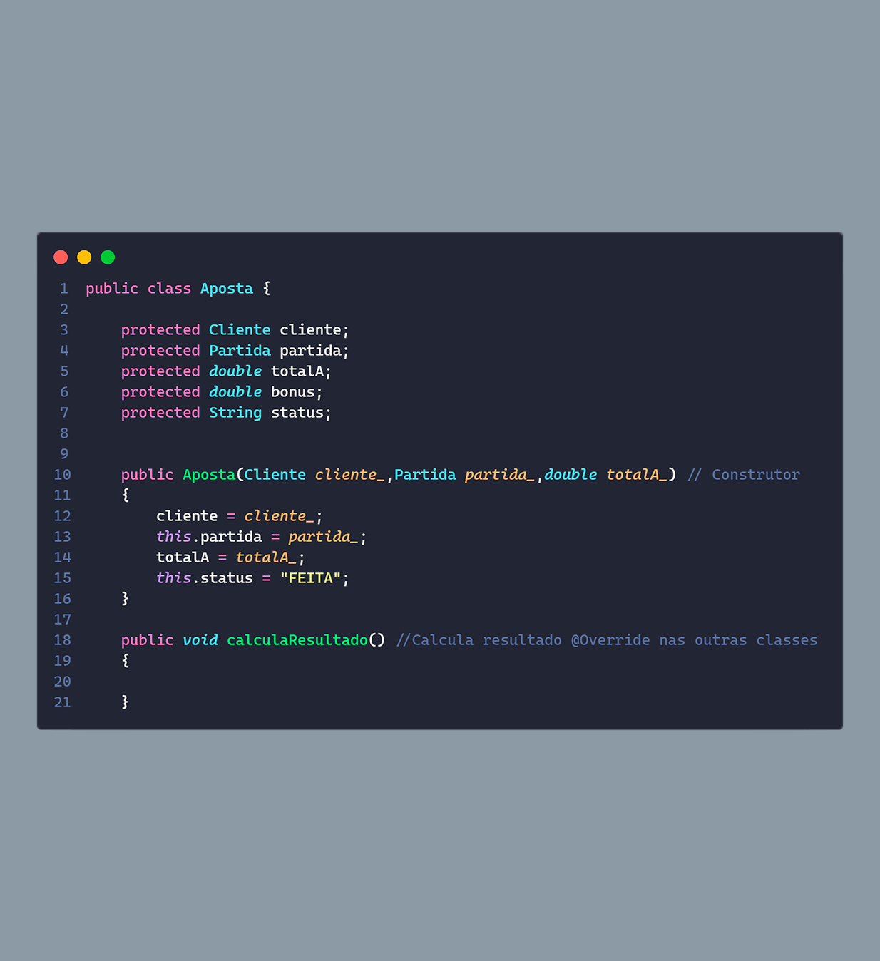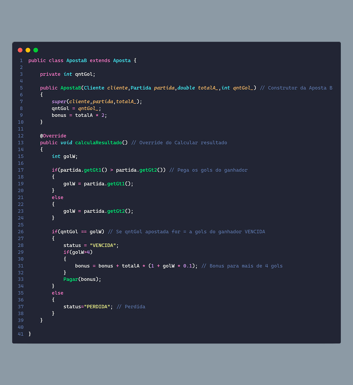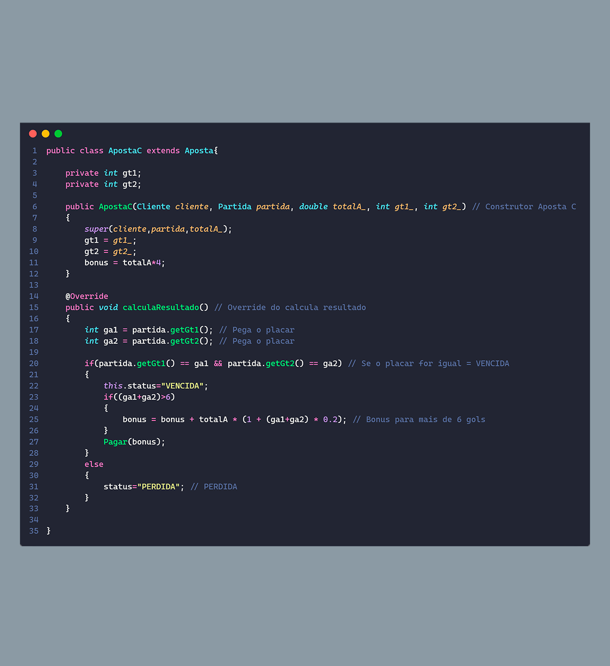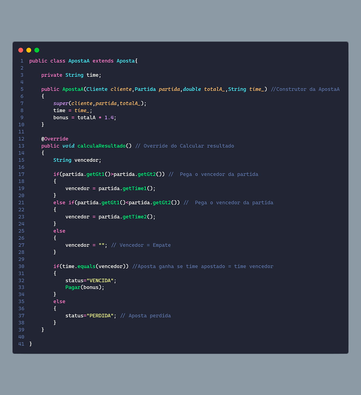 Já para a parte da aposta, ela possui um objeto pai, que possui as funções gerais e sua definição, que possui: o objeto do cliente e da partida, o total apostado e sua situação, ela também possui algumas funções para auxílio do sistema como, por exemplo, a função para fazer pagamento da aposta. E para as classes filhas, elas herdam as funções e acabam fazendo alterações para cada tipo de aposta, assim como no seu construtor.