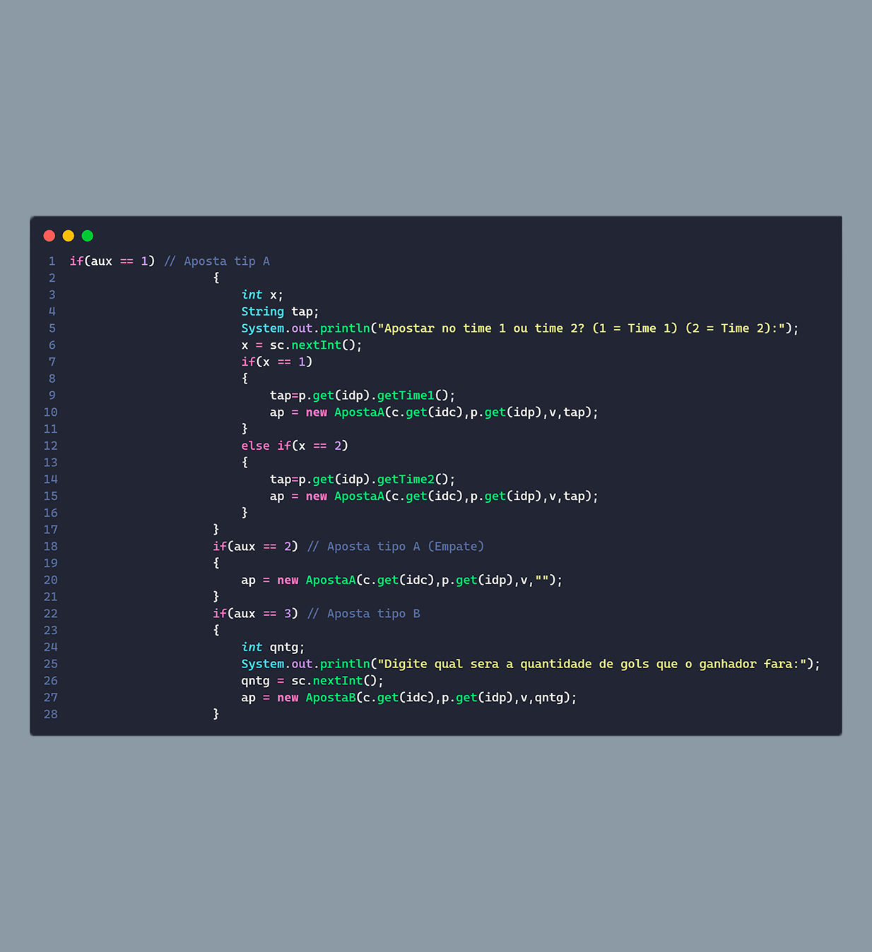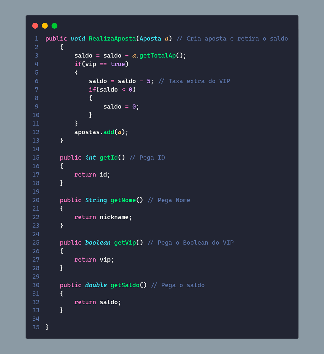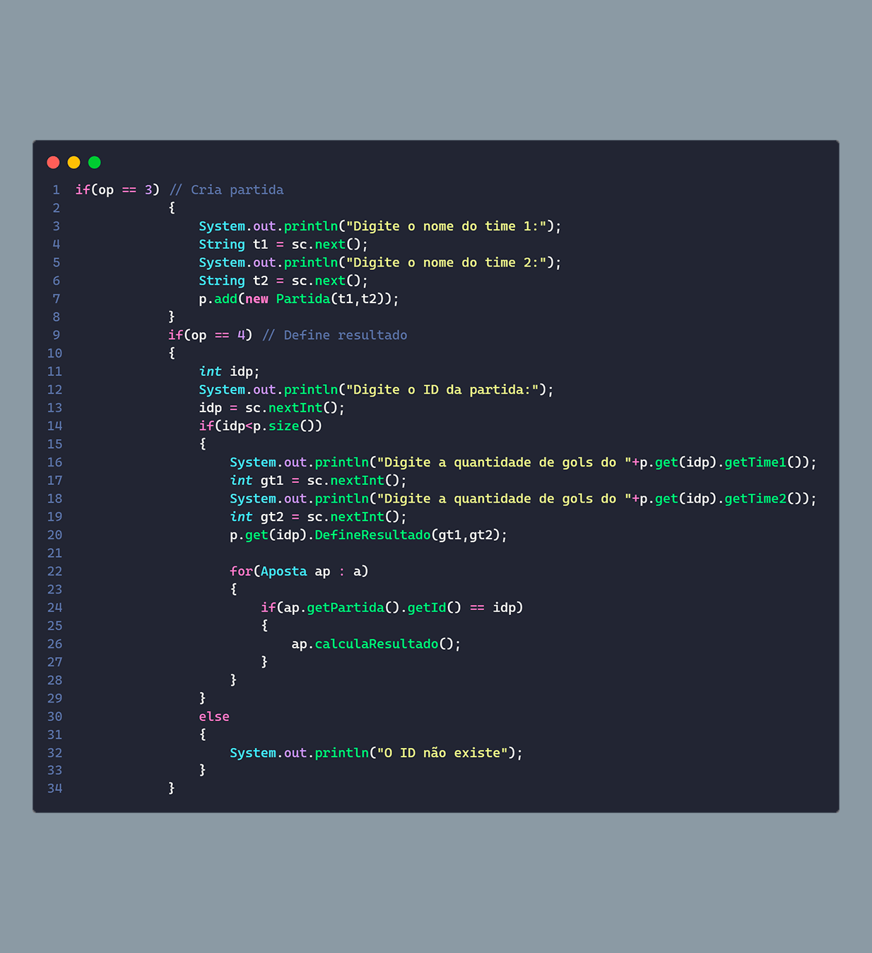 Para a estruturação do código separamos o sistema em 3 objetos, apostas, clientes e partidas, os clientes possuem alguns atributos, como: id, nome, saldo, se ele é VIP ou não, e as apostas que ele fez, além também das funções para auxílio, como, por exemplo, adicionar créditos e realizar apostas. As partidas seguem a mesma estrutura, possuem um id, o nome dos times que estão jogando, e o placar do jogo, ela também possui funções auxiliares como, por exemplo, para definir o resultado da partida.