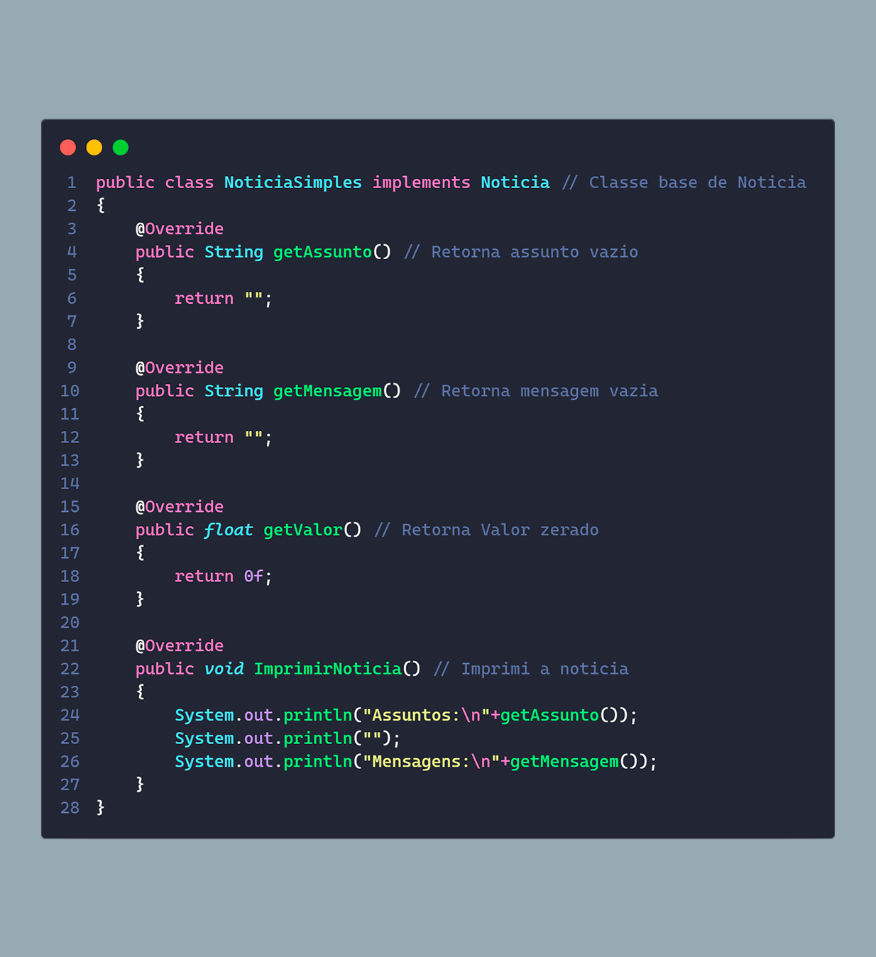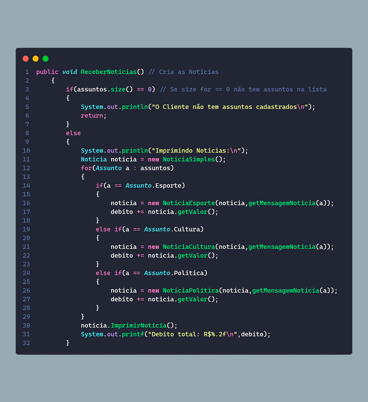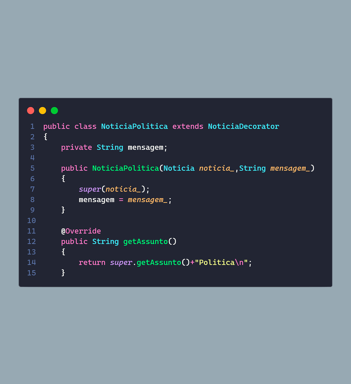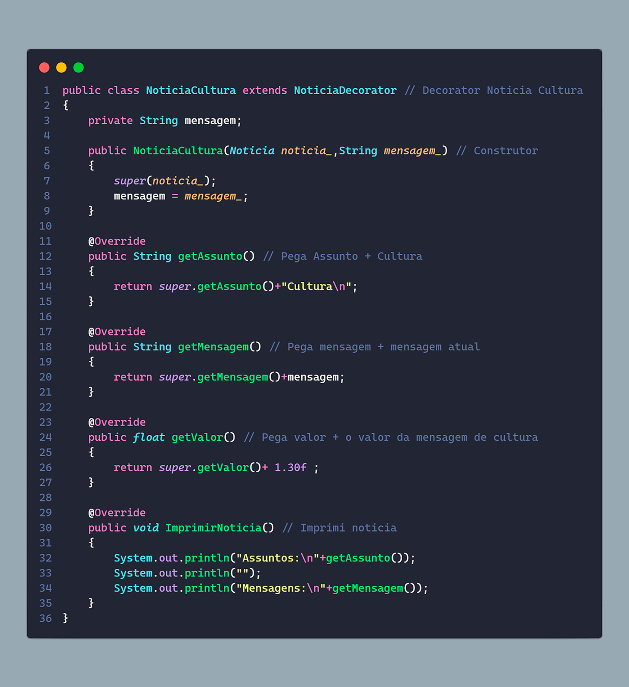 Já para a parte de notícias, ela possui o padrão de projeto Decorator, onde cada classe Decorator específica está relacionada a um dos possíveis assuntos. Seu objeto principal possui somente as declarações dos métodos, já que é usado o padrão Decorator, já a classe Decorator possui a funcionalidade genérica de cada função, já para os objetos para cada tipo de notícia, ele possui as funções, especificas, e no arquivo Principal, utilizamos somente uma variável para criar a notícia para também seguirmos o padrão Decorator.