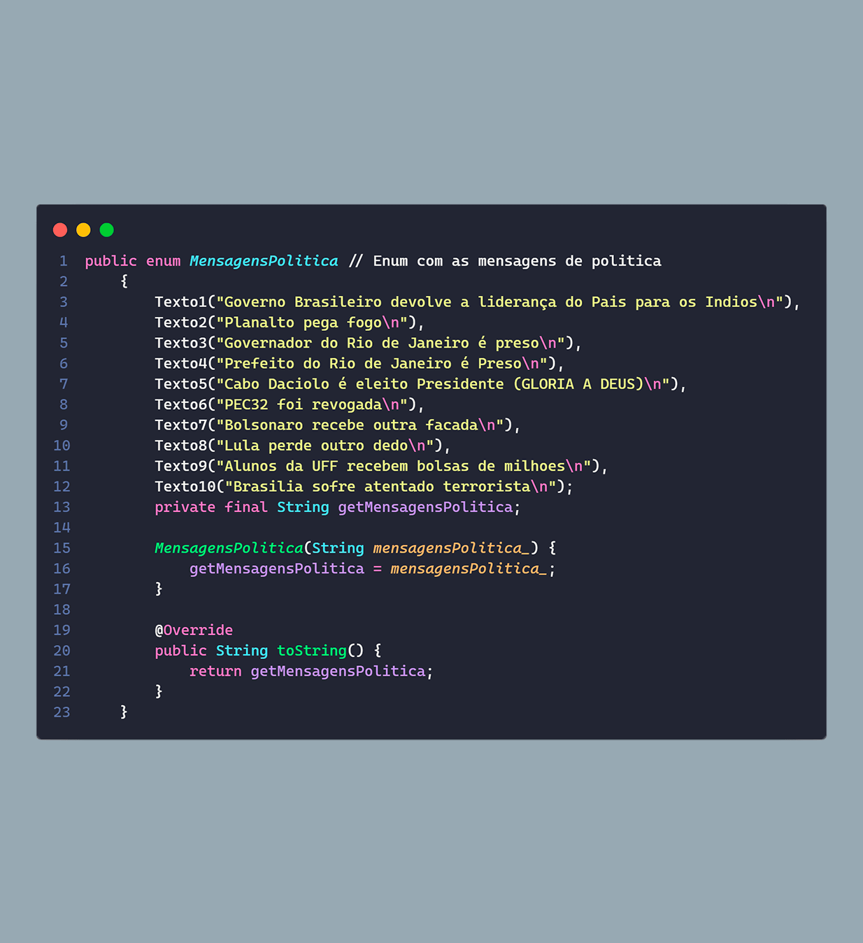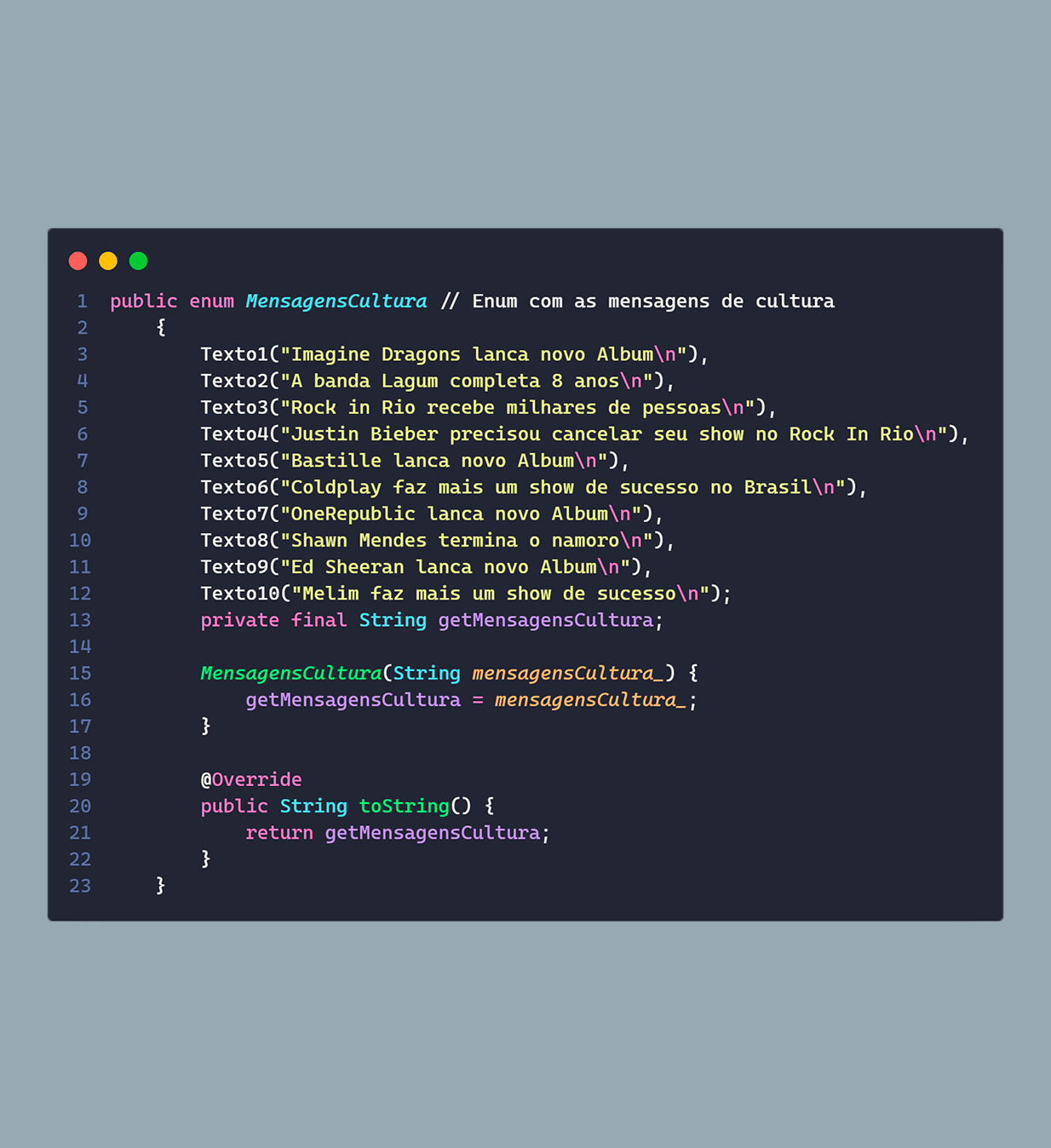 Para a estruturação do código separamos o sistema em 3 objetos, notícias, clientes e gerador de mensagens, os clientes possuem alguns atributos, como: id, o seu débito, e a lista de assuntos selecionados, além também das funções para auxílio, como, por exemplo, inserir e remover assuntos e receber as notícias. O gerador de mensagens é um pouco diferente, ele só possui funções, sendo cada uma delas funções para retornar uma das notícias diárias.