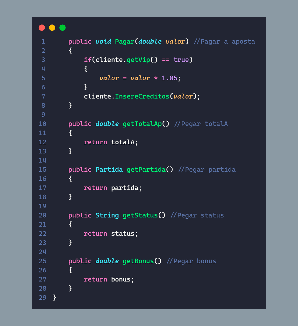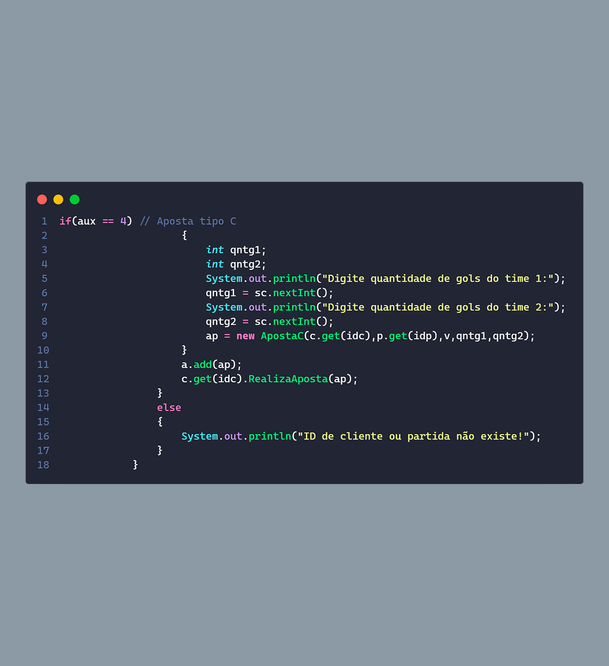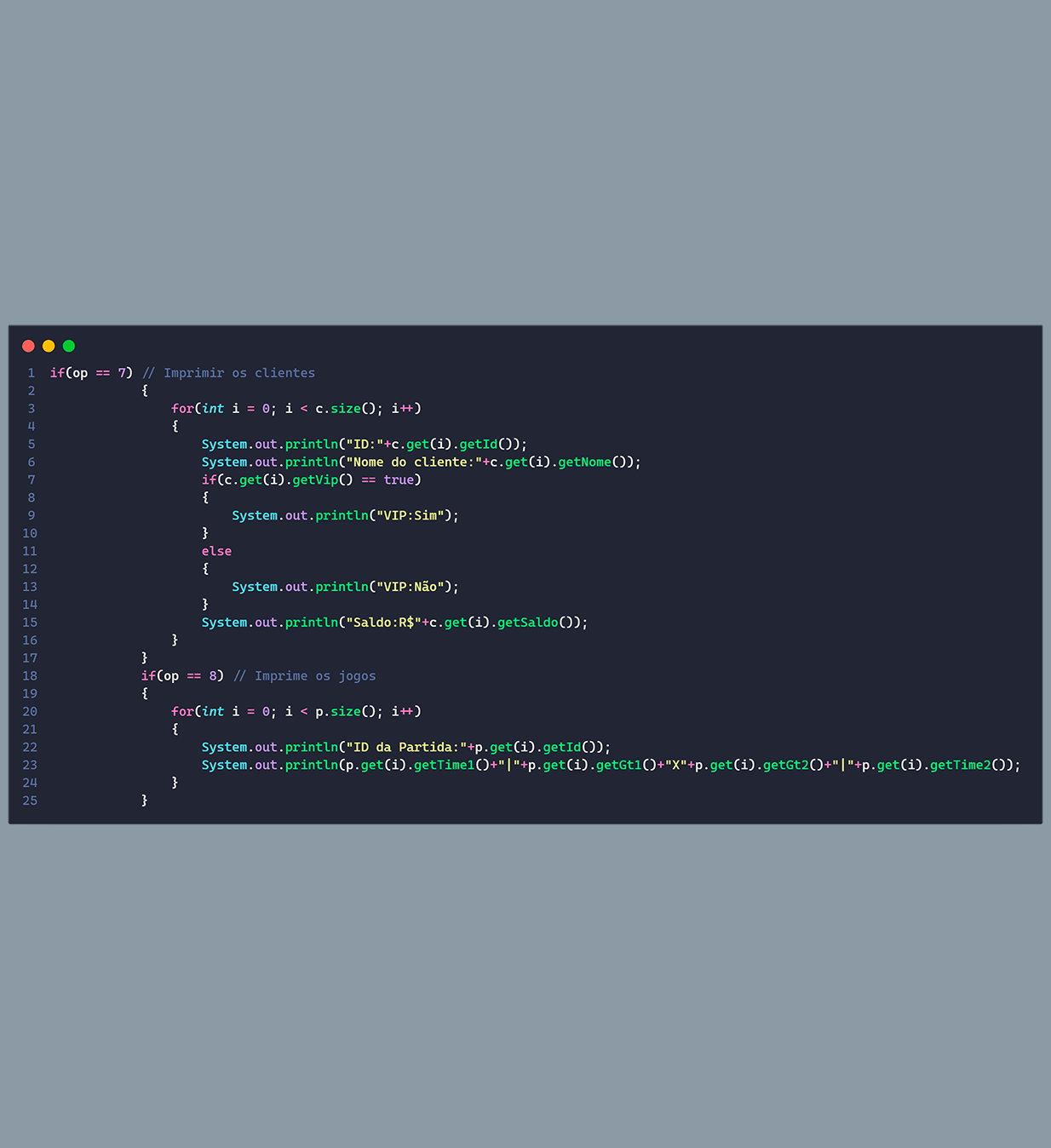 Para a estruturação do código separamos o sistema em 3 objetos, apostas, clientes e partidas, os clientes possuem alguns atributos, como: id, nome, saldo, se ele é VIP ou não, e as apostas que ele fez, além também das funções para auxílio, como, por exemplo, adicionar créditos e realizar apostas. As partidas seguem a mesma estrutura, possuem um id, o nome dos times que estão jogando, e o placar do jogo, ela também possui funções auxiliares como, por exemplo, para definir o resultado da partida.