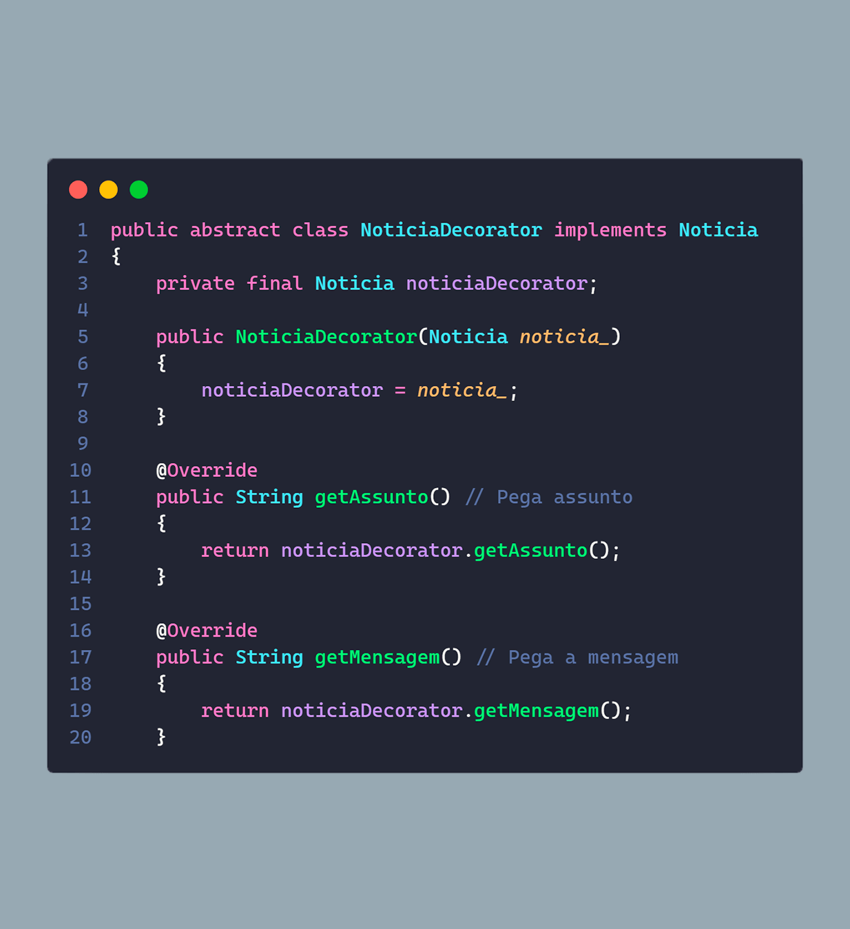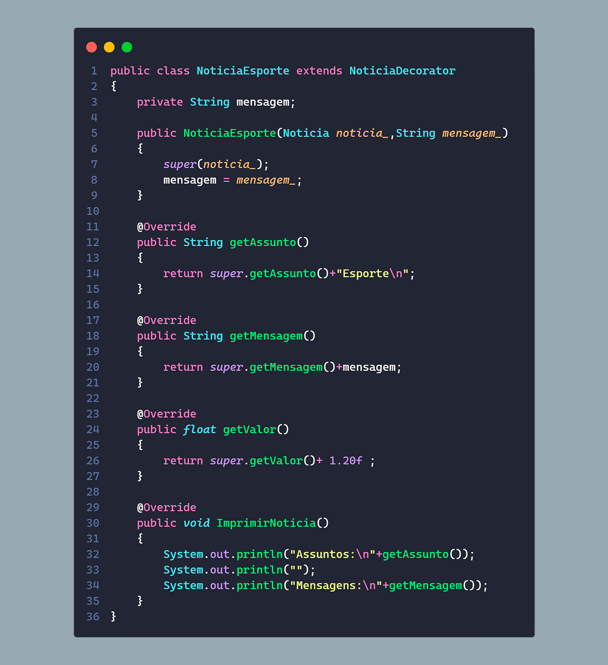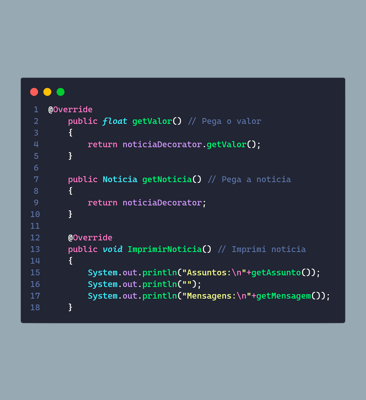 Já para a parte de notícias, ela possui o padrão de projeto Decorator, onde cada classe Decorator específica está relacionada a um dos possíveis assuntos. Seu objeto principal possui somente as declarações dos métodos, já que é usado o padrão Decorator, já a classe Decorator possui a funcionalidade genérica de cada função, já para os objetos para cada tipo de notícia, ele possui as funções, especificas, e no arquivo Principal, utilizamos somente uma variável para criar a notícia para também seguirmos o padrão Decorator.
